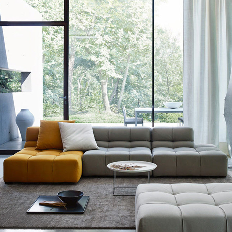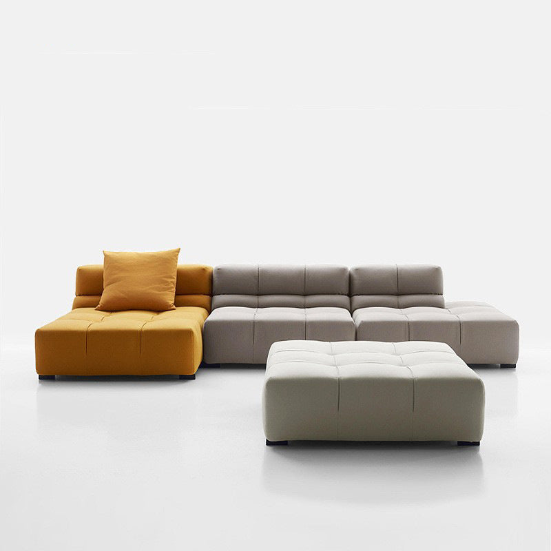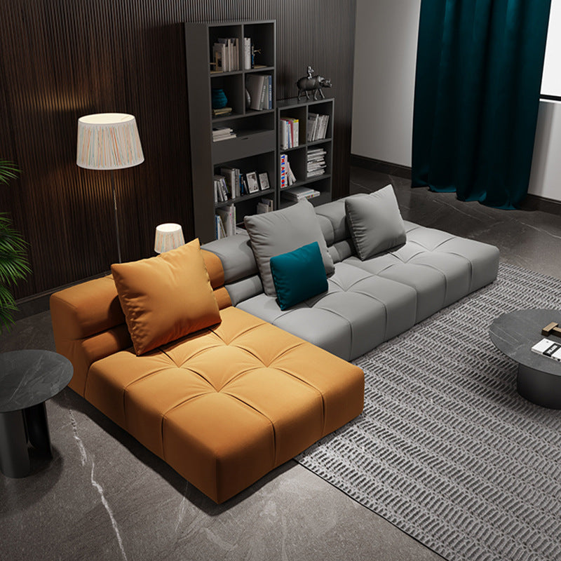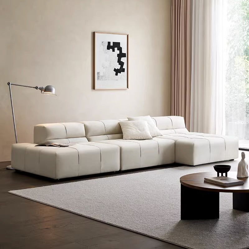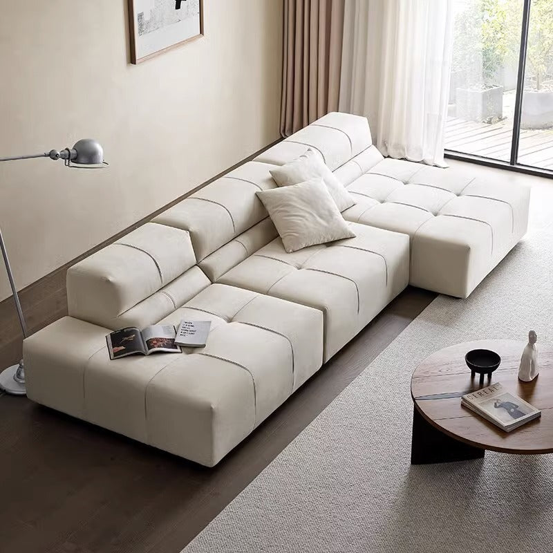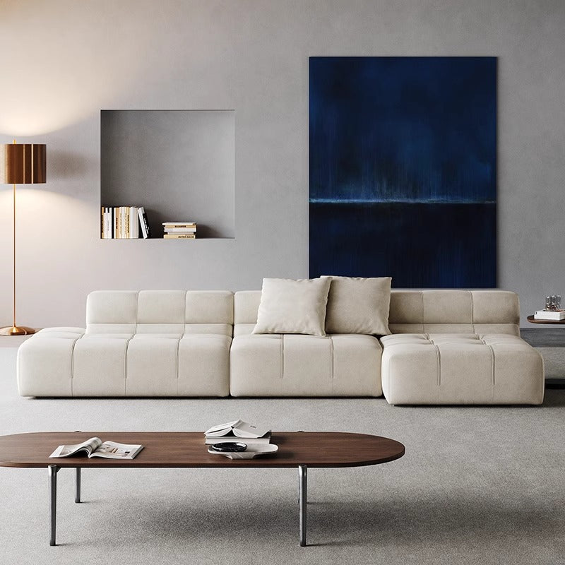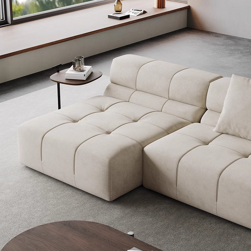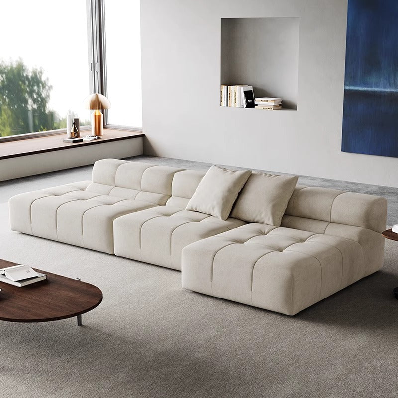 This elegant sectional sofa features a contemporary design with plush, tufted cushions and a soft, neutral fabric. Its low-profile and spacious seating make it perfect for modern living rooms, offering both comfort and style.
